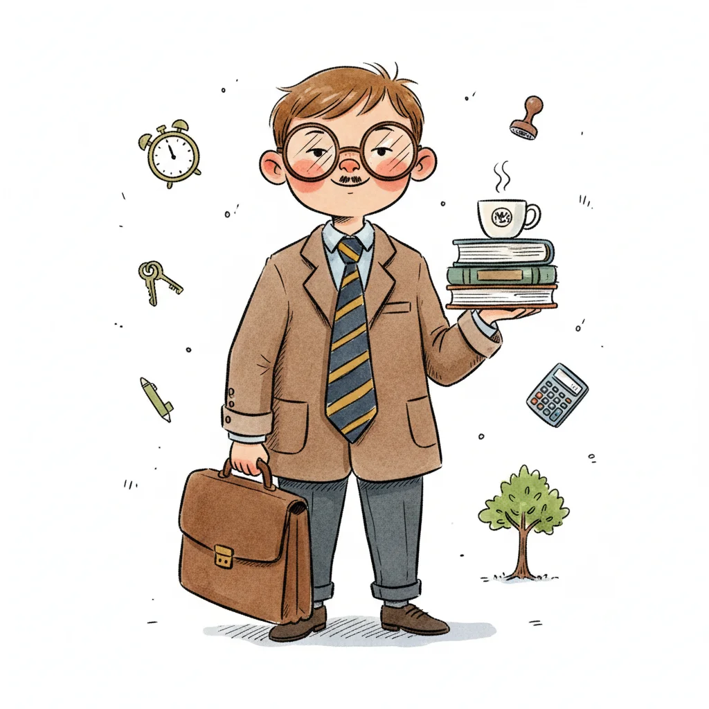 Geschäftiger Cartoon-Mann mit Brille, Anzug, Büchern, Kaffee und Aktenkoffer, umgeben von Symbolen.