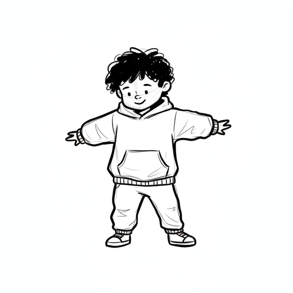 Schwarz-weiße Zeichnung eines lächelnden Kindes mit lockigem Haar in Hoodie und Jogginghose, Arme ausgestreckt.