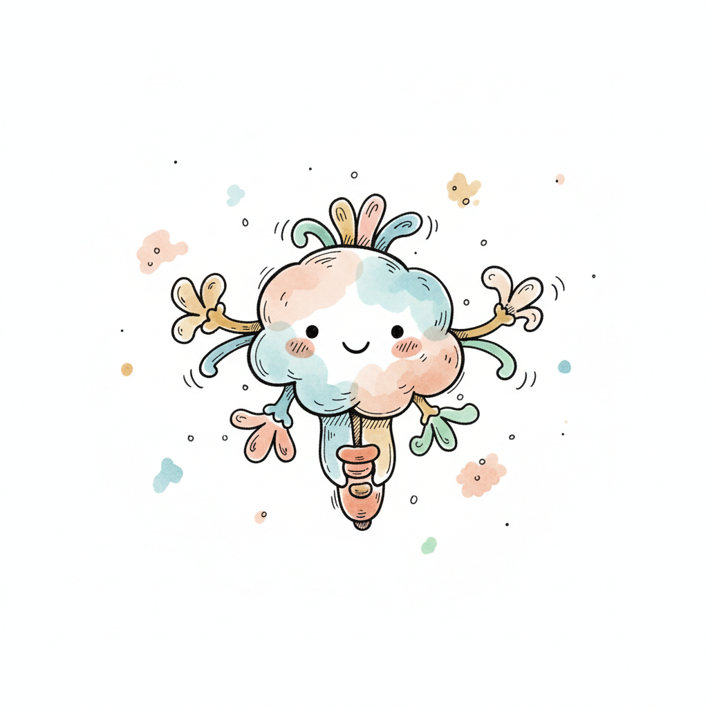 Niedliche, kindgerecht illustrierte Szene mit einem Kind oder einer Person als Hauptfigur, vor rein weißem Hintergrund, im frech-nordischen Aquarell-Skizzenstil. Klare, leicht wackelige Tuschekonturen, sichtbare Pinsel- und Strichtextur, dezente Schraffuren, weiche handgemalte Farbflächen in gedeckten Farben. Einfache, runde Formen. Keine harten Schatten, sondern sanfte, transparente Aquarellschichten. Leicht raue, handgezeichnete Linien statt glatter Vektorkanten. Subtile, vereinzelte Kritzelpunkte oder kleine Details im Hintergrund (wie Pünktchen oder feine Striche), aber keine echte Umgebung oder Landschaft. Die Figur ist mittig zentriert. Insgesamt charmant, humorvoll, warm und handgemacht wirkend. WICHTIG: Das Bild darf ABSOLUT KEINEN TEXT, KEINE BUCHSTABEN und KEINE ZAHLEN enthalten.