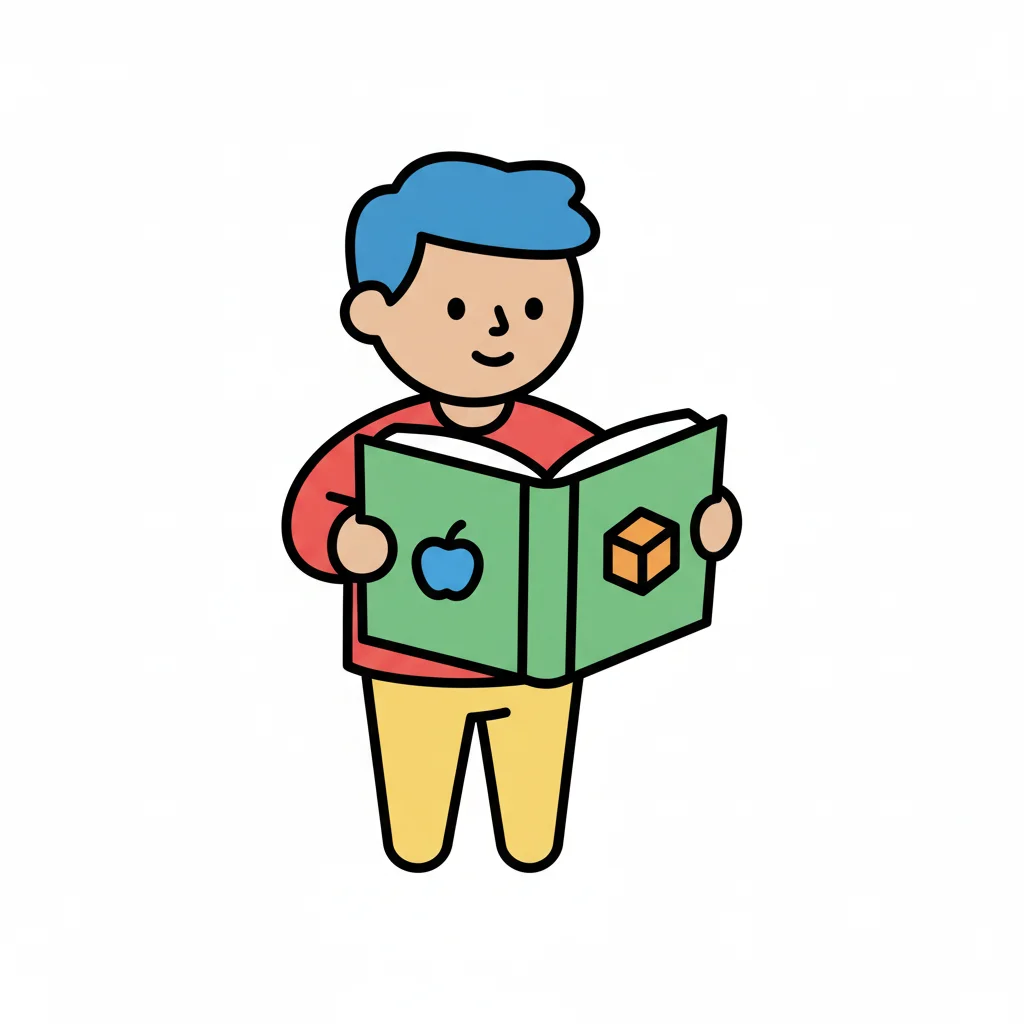 Illustration eines Jungen mit blauem Haar, der ein offenes grünes Buch mit Apfel- und Würfel-Symbolen liest.
