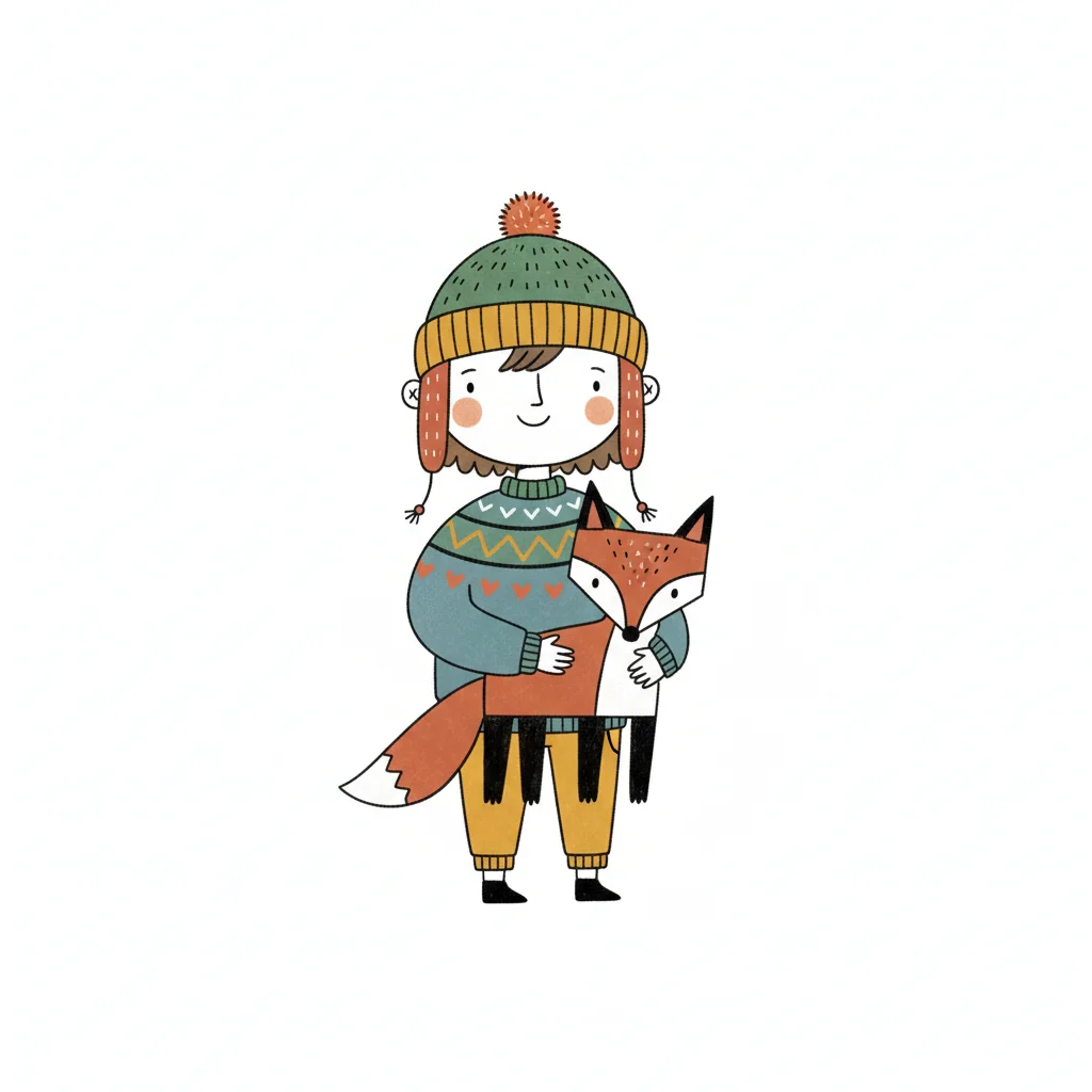 Niedliche Illustration eines Kindes in Winterkleidung, das einen Fuchs umarmt.