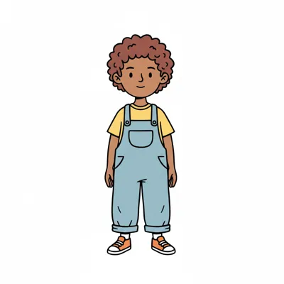 Illustration eines lächelnden Kindes mit braunen Locken, gelbem Shirt und blauer Latzhose.