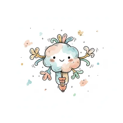 Niedliche, bunte Wolkenkreatur mit lächelndem Gesicht und Armen, die fröhlich tanzt.
