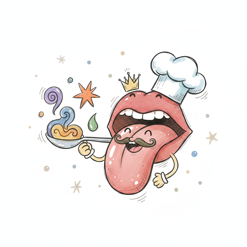Lustiges Cartoon-Maul mit Kochmütze und Zunge als Koch, der dampfendes Essen serviert.