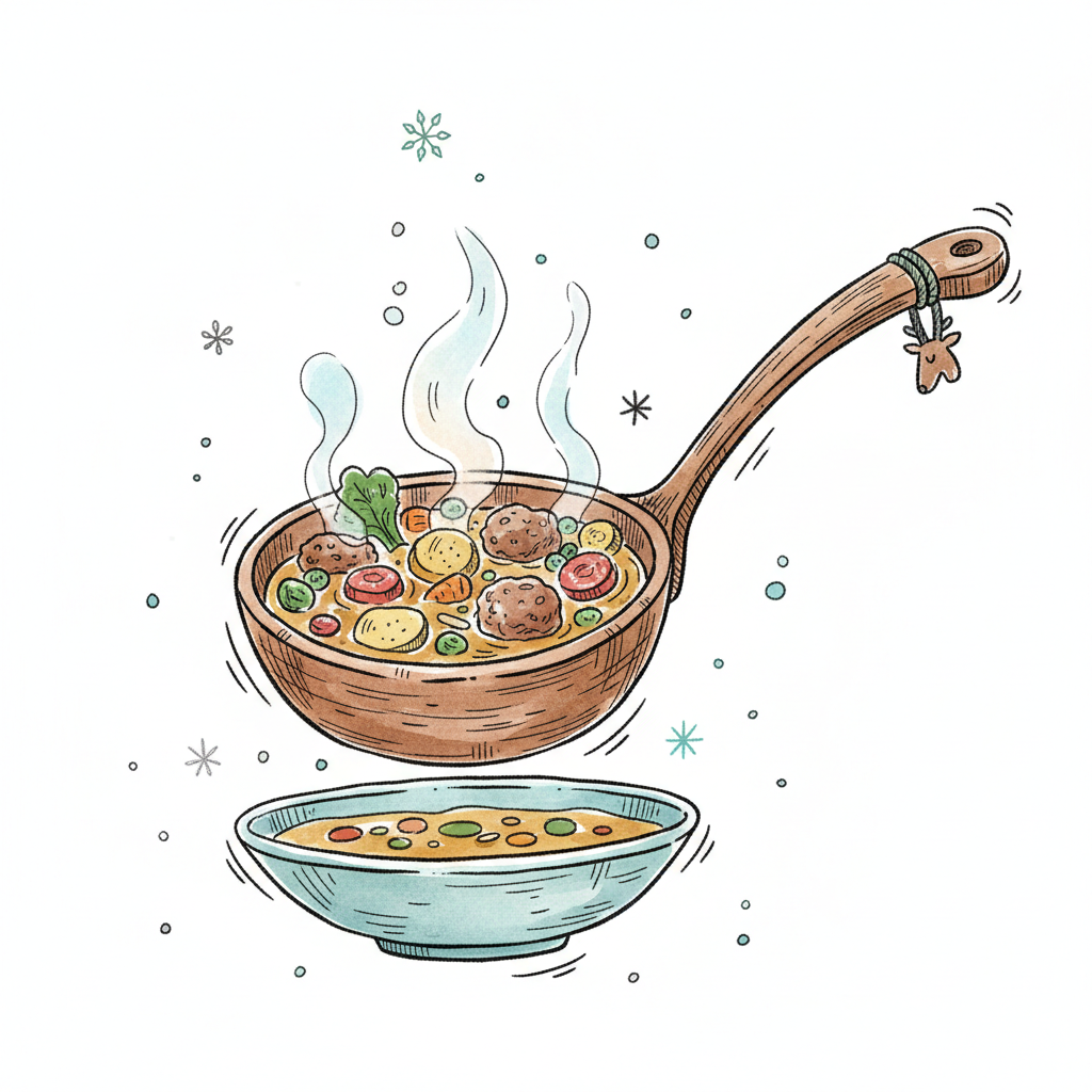 Illustrierte Szene: Dampfende Suppe mit Fleischbällchen und Gemüse wird aus einer Kelle in eine Schale gefüllt.