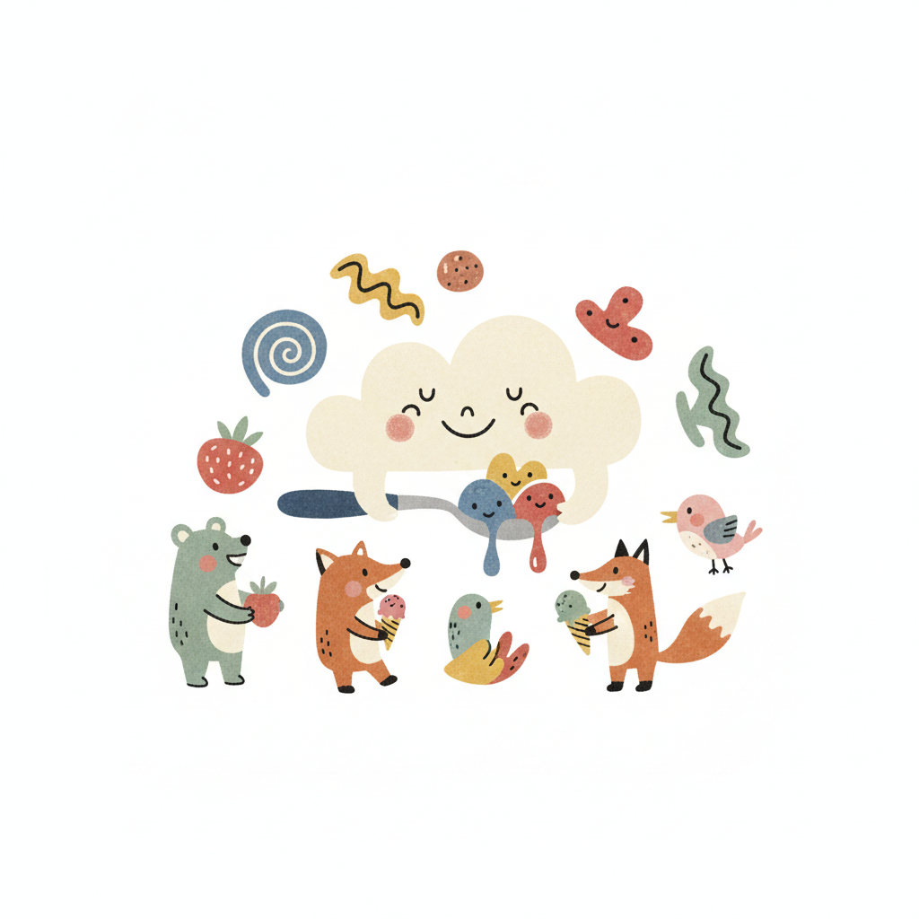 Niedliche Tiere und eine lächelnde Wolke genießen Eiscreme und Früchte in einem verspielten Cartoon-Stil.