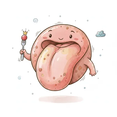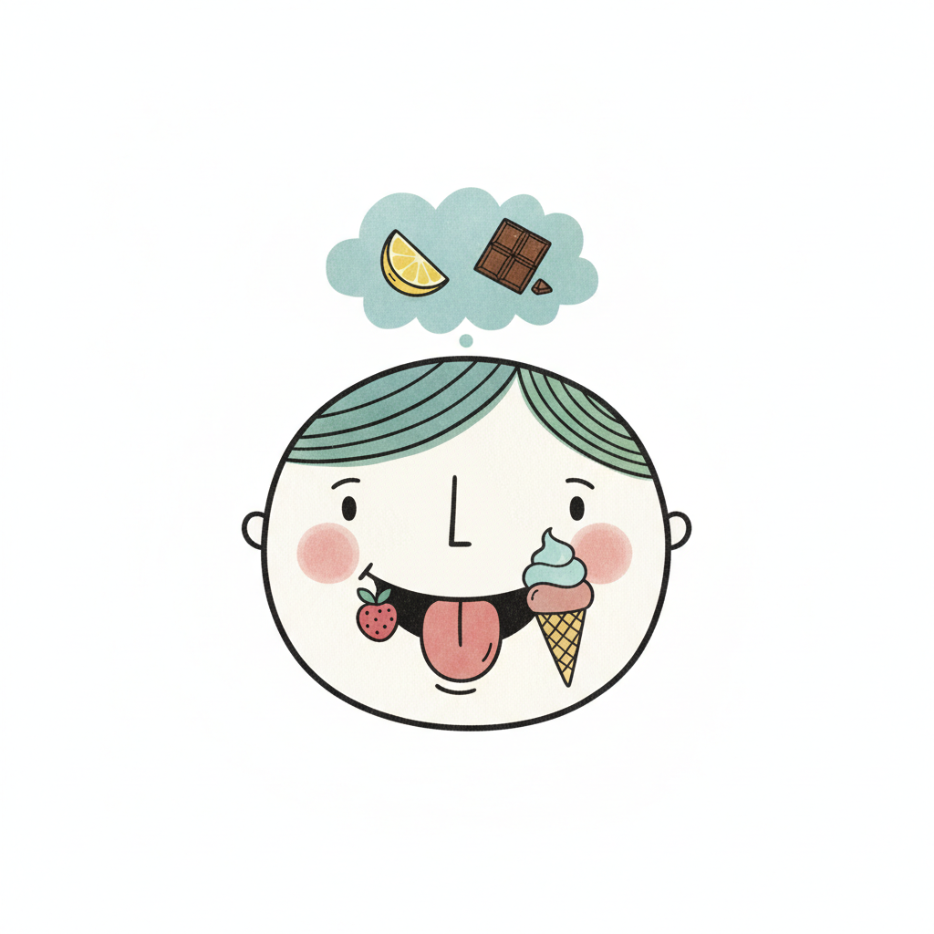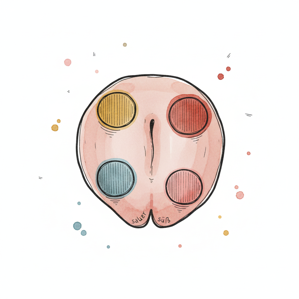 Aquarell-Illustration einer Zunge mit farbigen Geschmackszonen, beschriftet mit 'sauer' und 'süß'.
