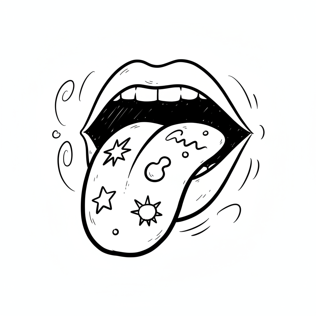 Schwarz-weiß-Doodle eines offenen Mundes mit Zunge, die verschiedene Symbole zeigt.