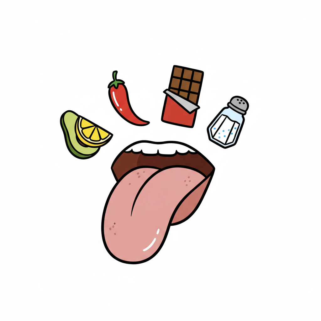 Offener Mund mit Zunge, umgeben von Chili, Limette, Schokolade und Salz – die Geschmäcker.