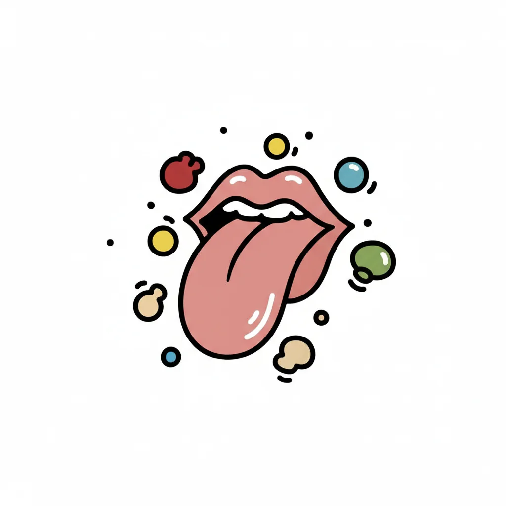 Stilisierte Lippen mit herausgestreckter Zunge, umgeben von bunten Blasen/Bonbons.