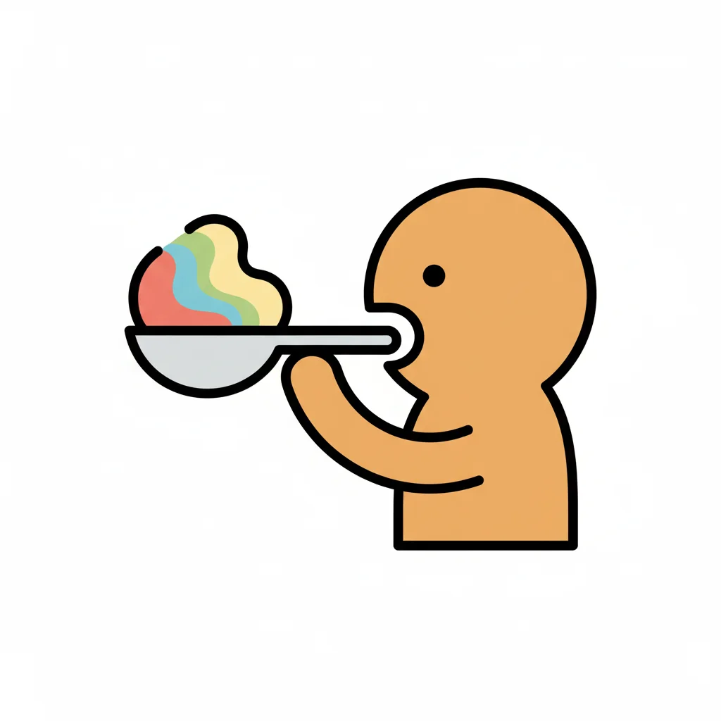 Stilisierte Person isst bunte Eiscreme oder Shaved Ice mit einem Löffel.