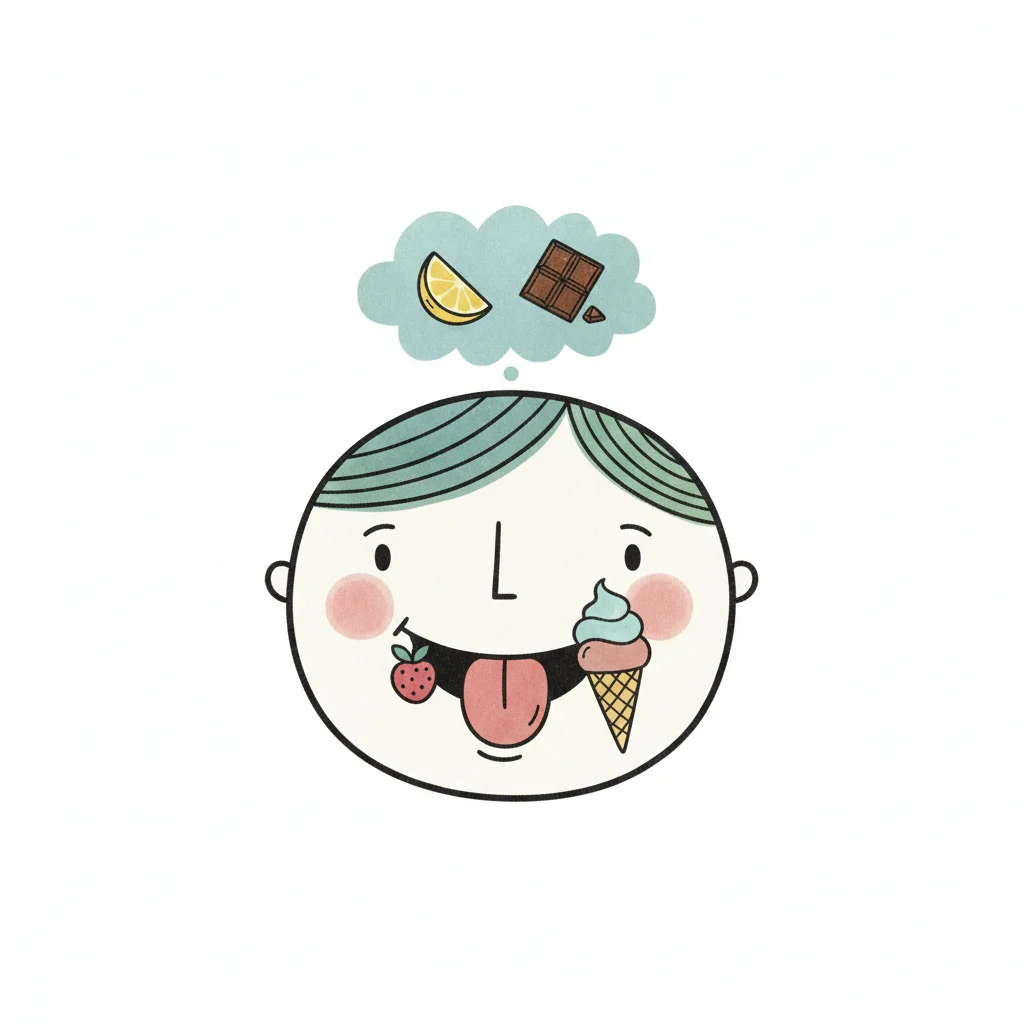 Niedliches Cartoon-Gesicht mit Erdbeere, Eis und Gedanken an Zitrone und Schokolade.