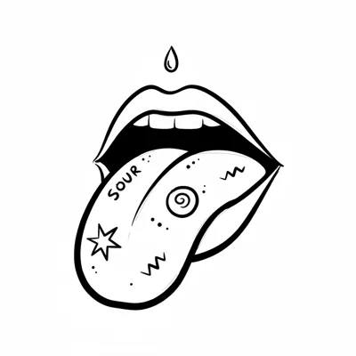 Schwarz-weiße Illustration eines offenen Mundes mit herausgestreckter Zunge, auf der 'SOUR' steht.