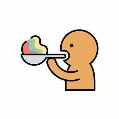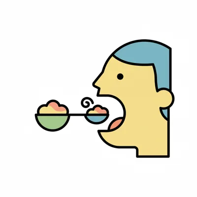 Stilisierte Darstellung einer Person, die mit einem Löffel dampfendes Essen aus einer Schale isst.