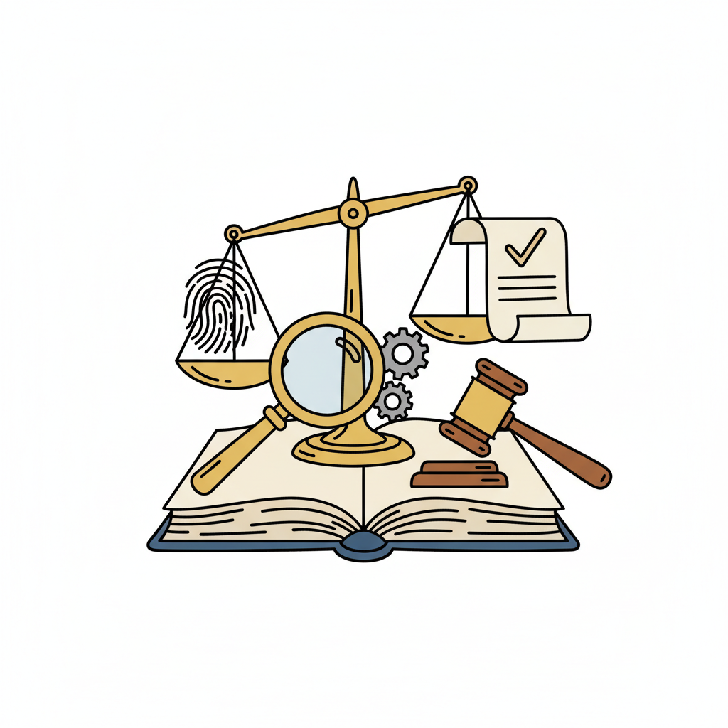Rechtssymbole: Waage, Fingerabdruck, Lupe, Gesetzbuch, Hammer. Darstellung von Gerechtigkeit & Ermittlung.