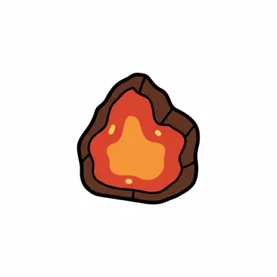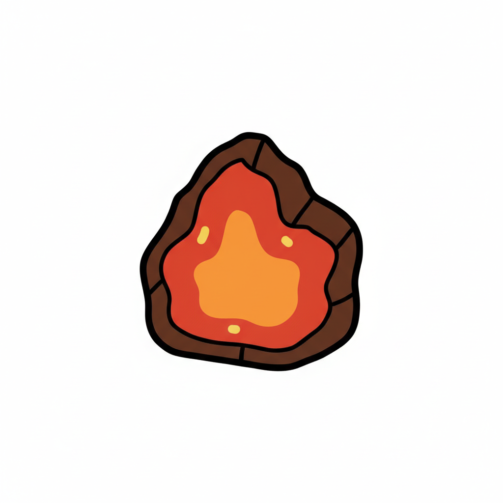 Cartoon-Darstellung eines glühenden Kerns in einer braunen, steinartigen Schale auf weißem Grund.