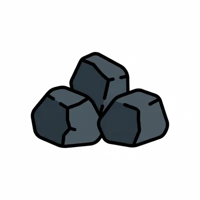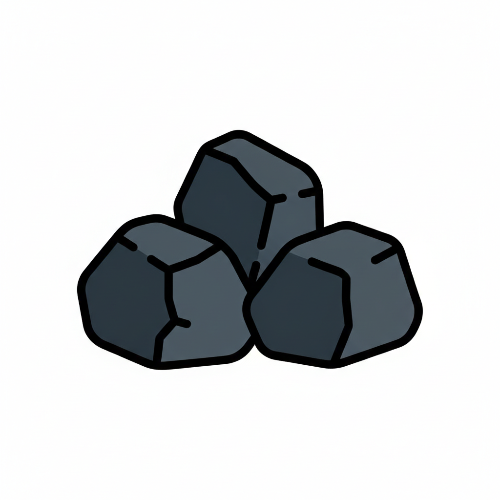 Drei stilisierte, dunkle Kohle- oder Gesteinsbrocken mit schwarzem Umriss auf weißem Grund.