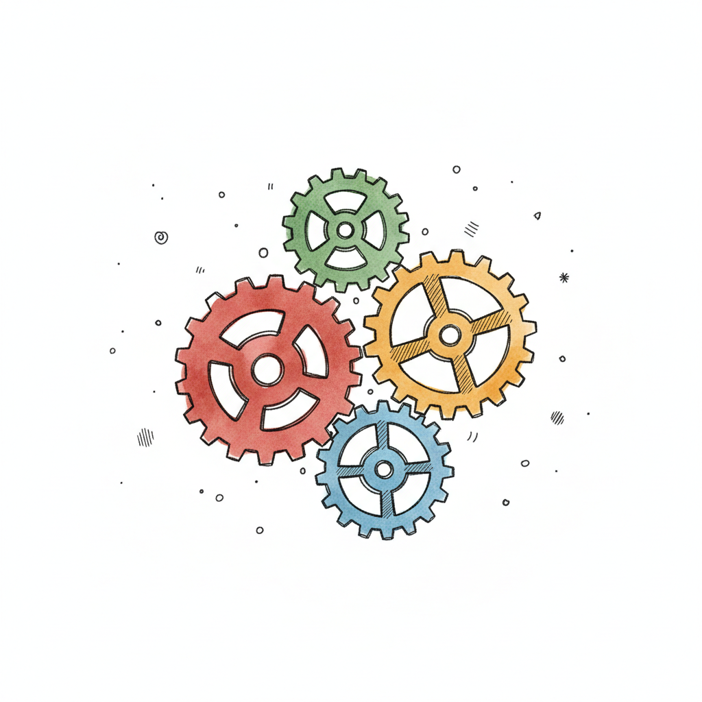 Fünf bunte, ineinandergreifende Zahnräder im handgezeichneten Stil.