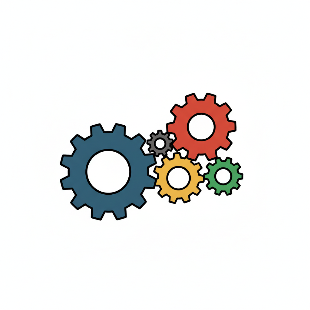 Drei bunte, ineinandergreifende Zahnräder im Cartoon-Stil, eines davon mit einem zwinkernden Gesicht.