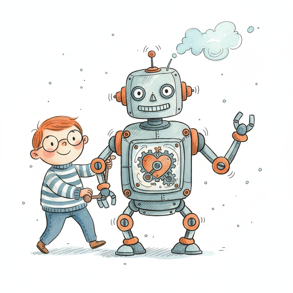 Ein Junge mit Brille hält den Arm eines freundlichen Roboters mit Herzgetriebe und Dampf aus dem Kopf.