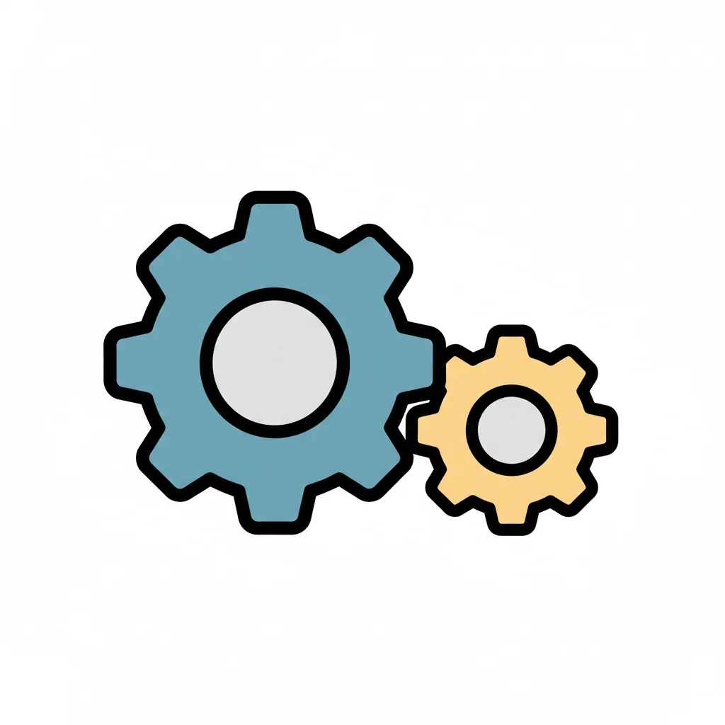 Zwei farbige Zahnräder, blau und gelb, greifen ineinander als einfaches Icon.