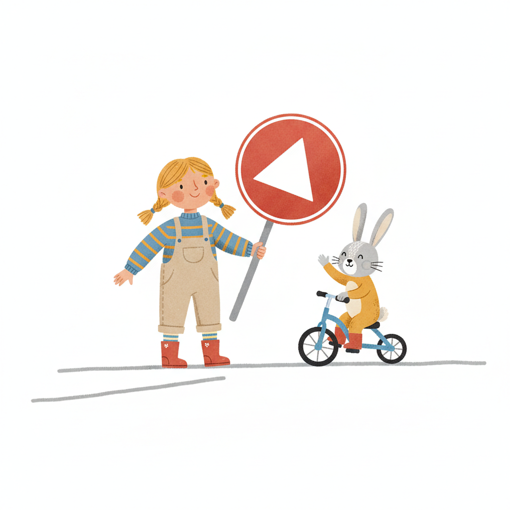 Mädchen mit Zöpfen hält ein Richtungsschild, ein Hase fährt Fahrrad und winkt. Kinderillustration.