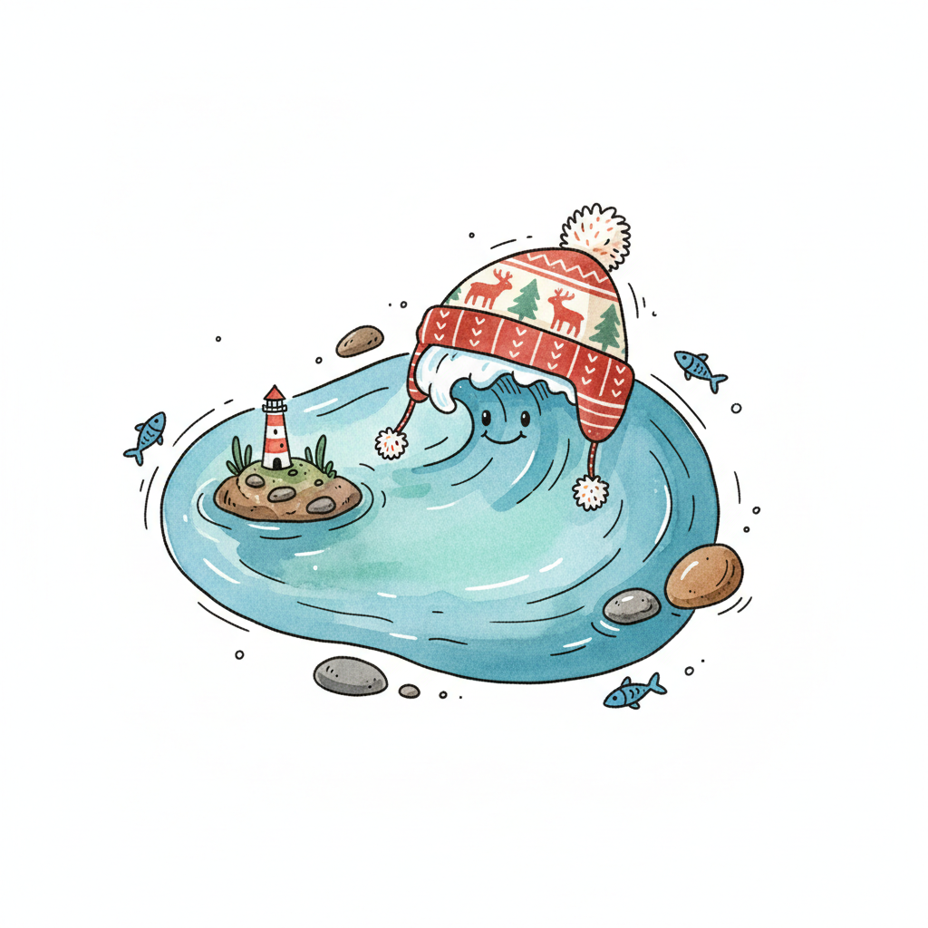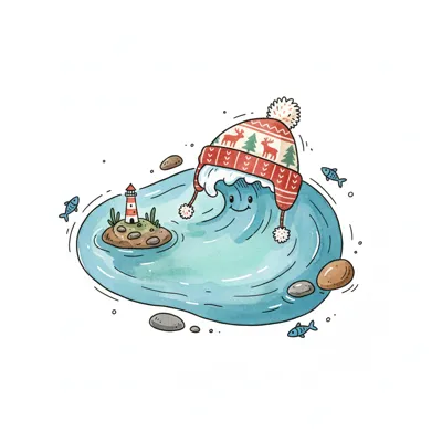 Niedliche Cartoon-Welle mit Wintermütze lächelt neben einem Leuchtturm auf einer Insel.