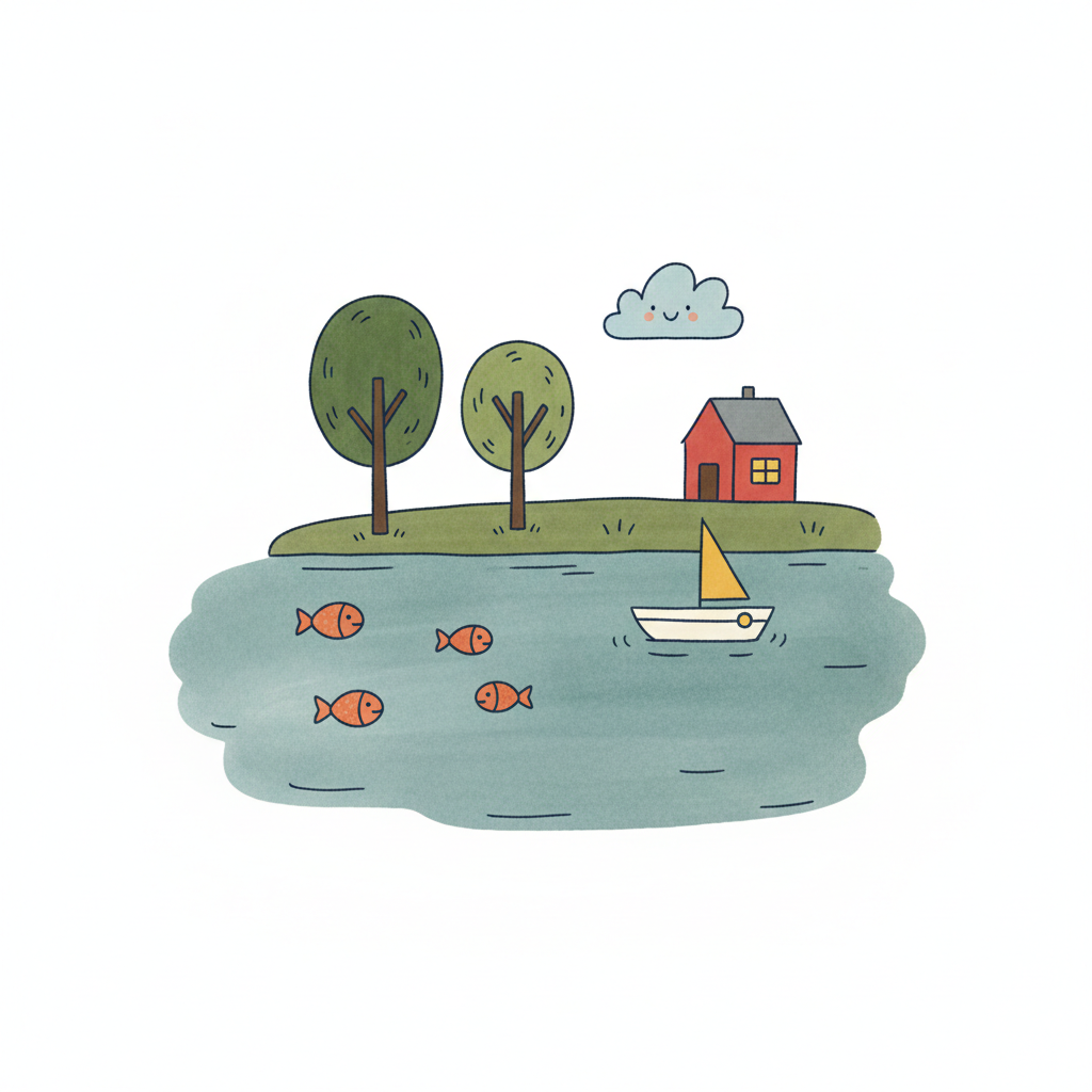 Idyllische Kinderzeichnung: Insel mit Haus, Bäumen, Boot, Fischen im Wasser, lächelnde Wolke.