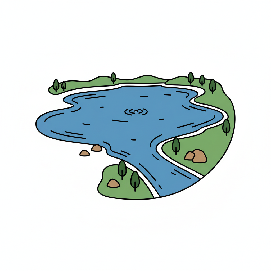 Stilisierte Darstellung einer Seenlandschaft mit Fluss, umgeben von grünen Hügeln und Bäumen.