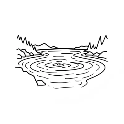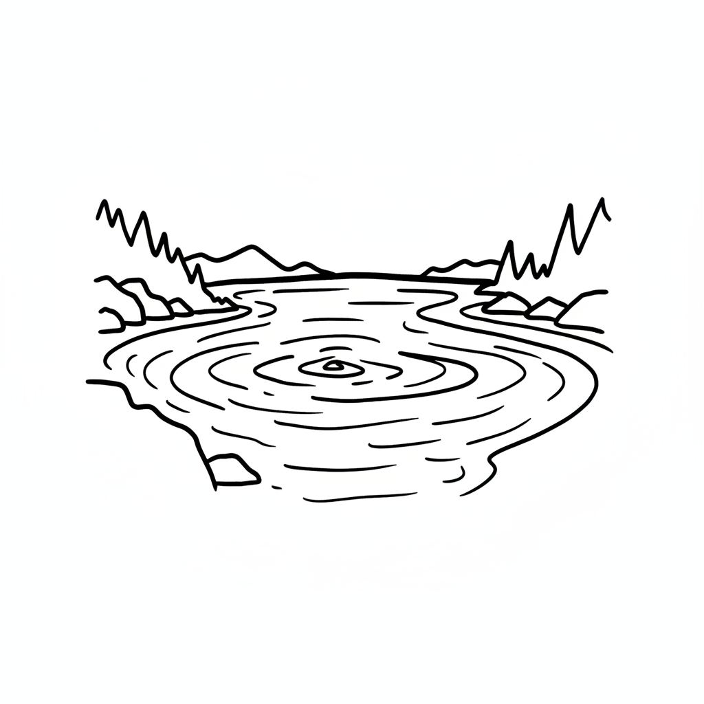 Stilisierte Schwarz-Weiß-Zeichnung eines Sees mit konzentrischen Wellen und Bergen im Hintergrund.