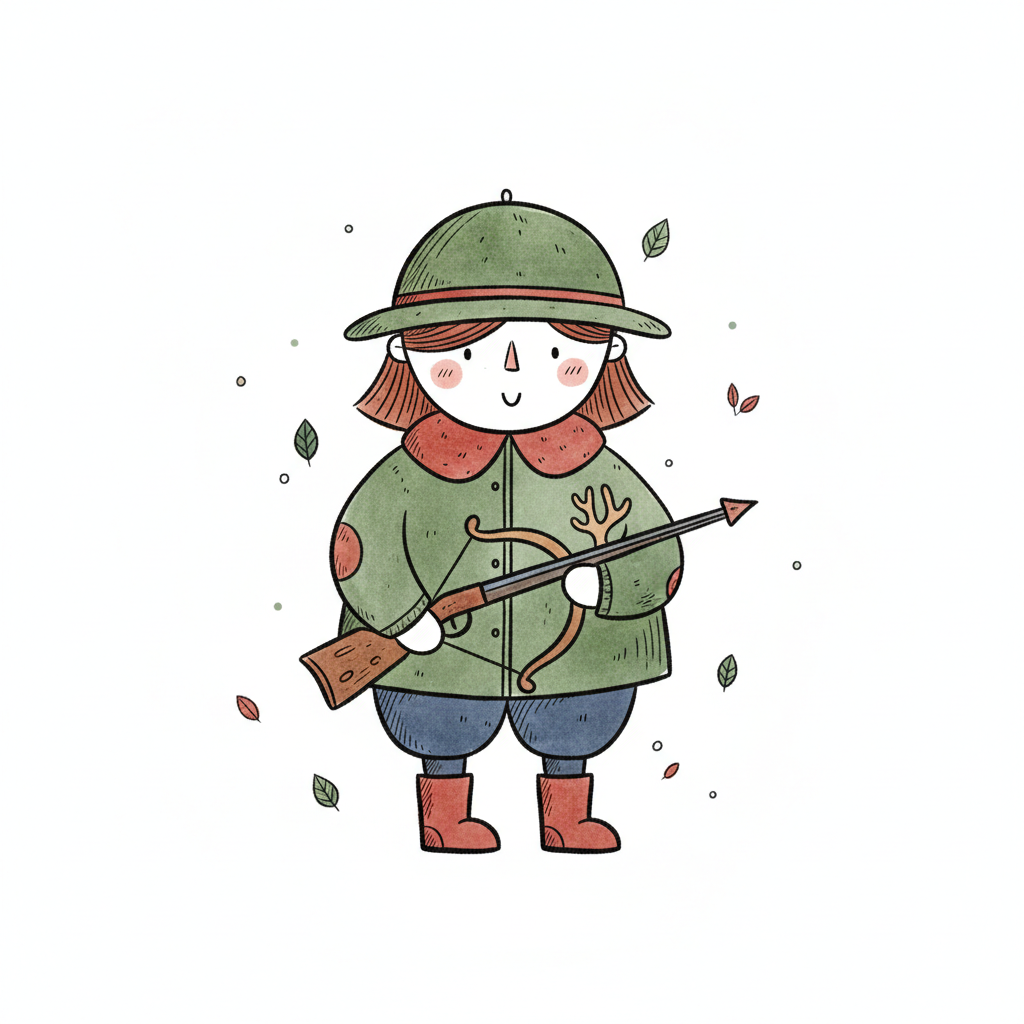 Niedliche Cartoon-Figur in Jägerkleidung mit Gewehr und Bogen, umgeben von Blättern.