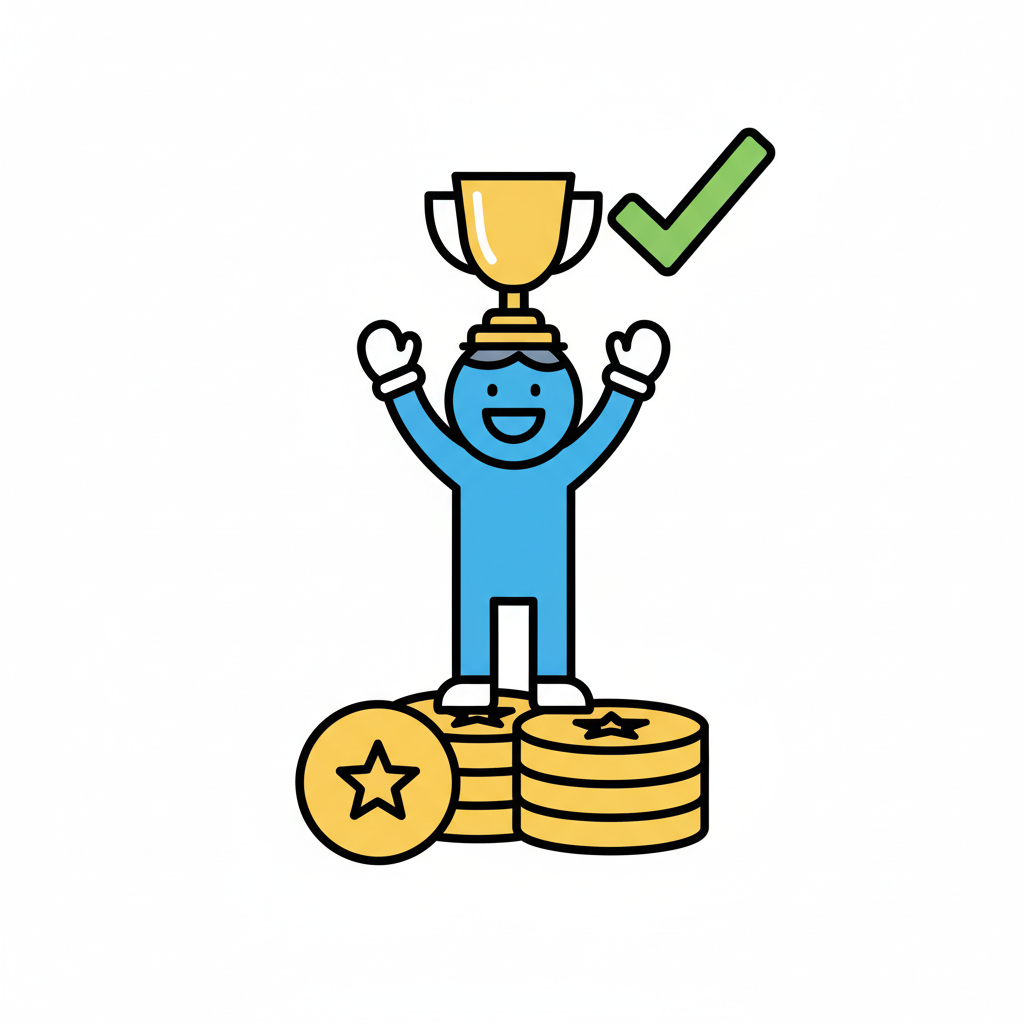 Glückliche Figur mit Trophäe auf Münzstapel, symbolisiert Erfolg und Belohnung.