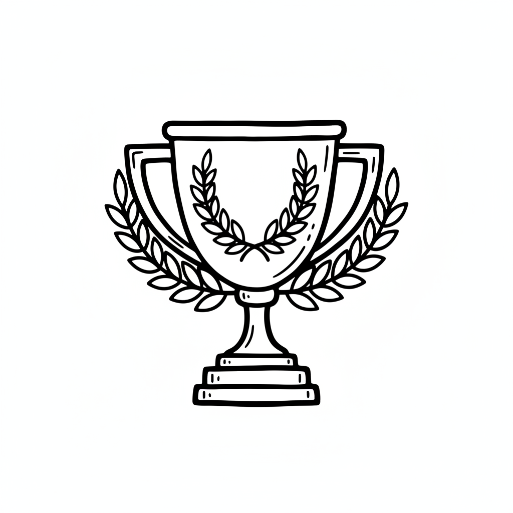 Schwarz-weiße Strichzeichnung eines Pokals mit Lorbeerkränzen, Symbol für Sieg und Erfolg.
