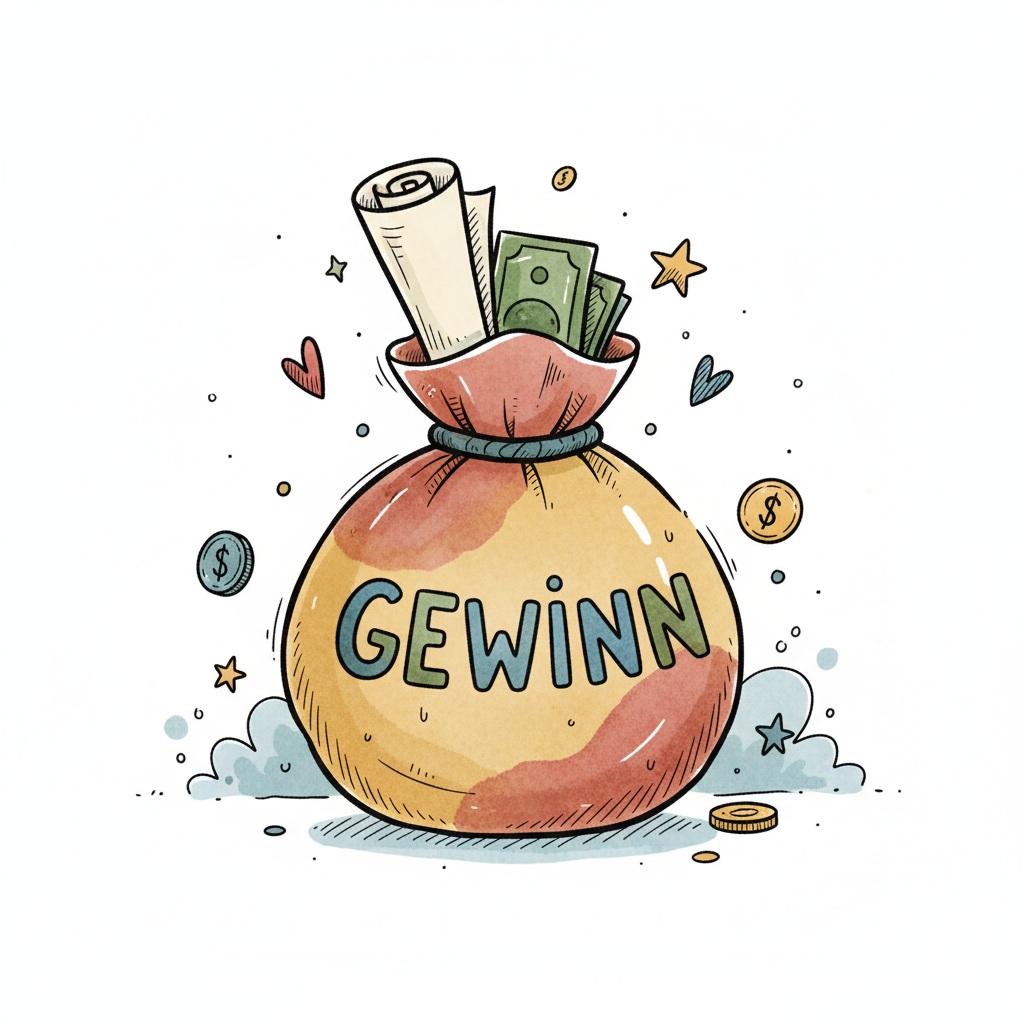 Bunter Geldsack mit "GEWINN"-Aufschrift, gefüllt mit Geld und Papier, umgeben von Sternen und Herzen.
