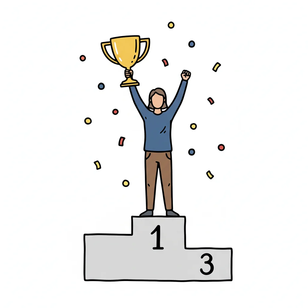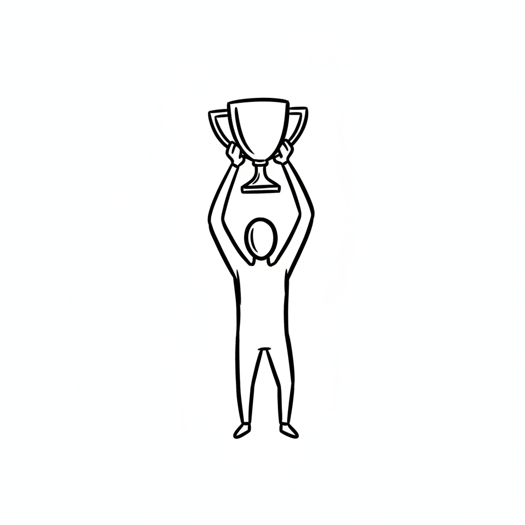 Strichzeichnung: Eine Person feiert mit einem Pokal über dem Kopf.