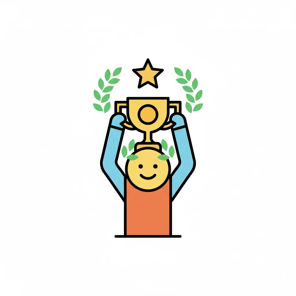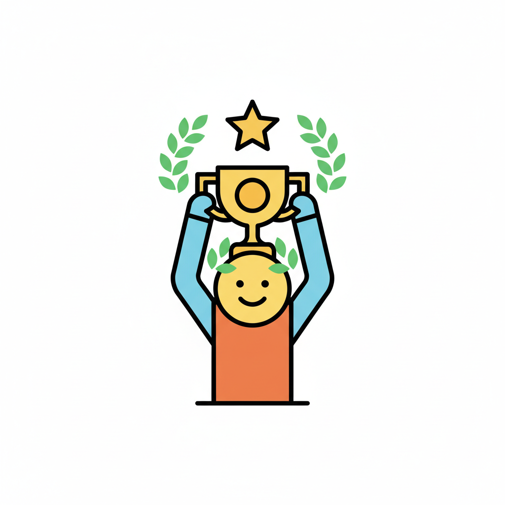 Glückliche Figur feiert Sieg mit goldenem Pokal, Lorbeerkränzen und Stern.