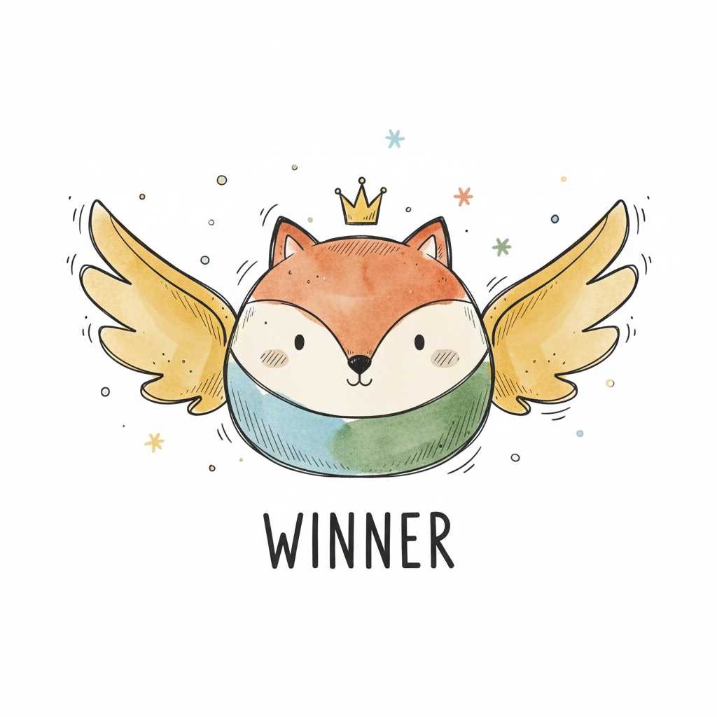 Süßer Aquarell-Fuchs mit Krone und Flügeln, der als 'WINNER' dargestellt ist.