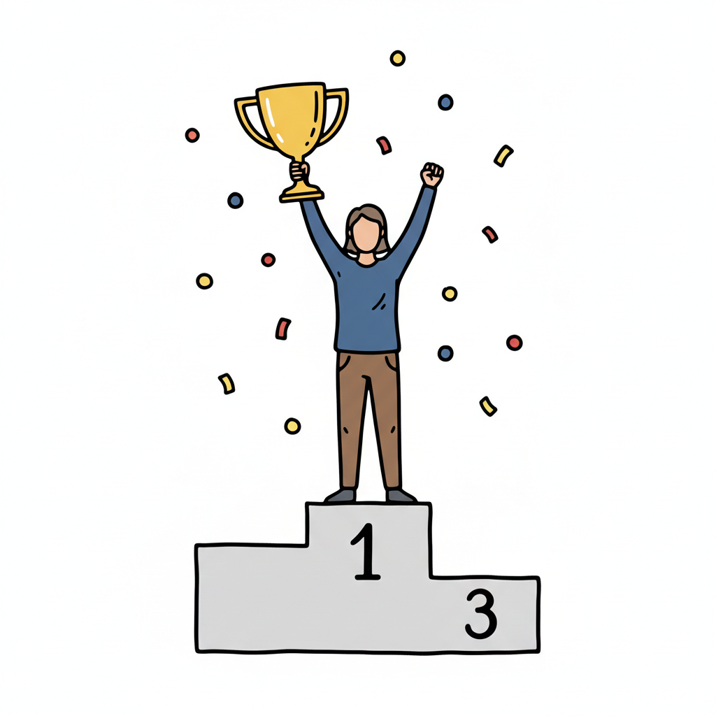 Person auf dem Siegertreppchen feiert mit Pokal und Konfetti den ersten Platz.