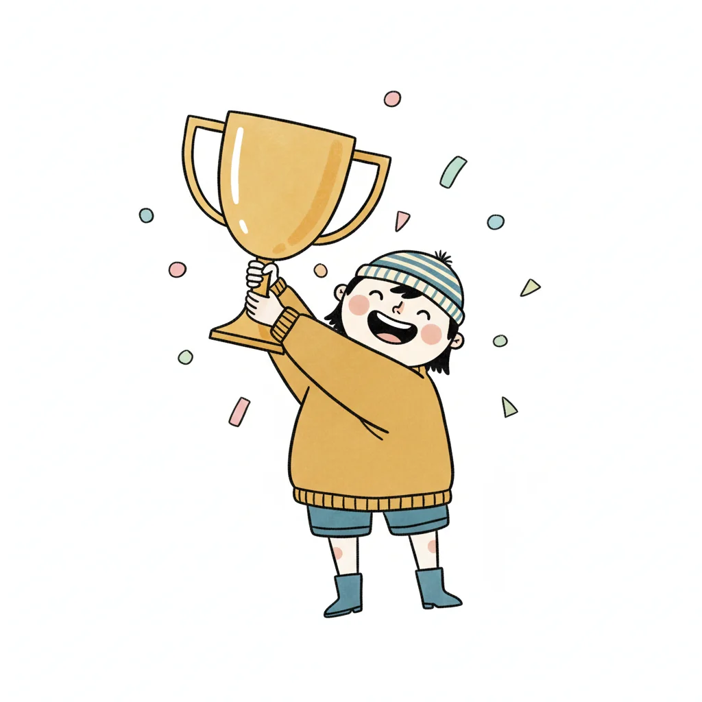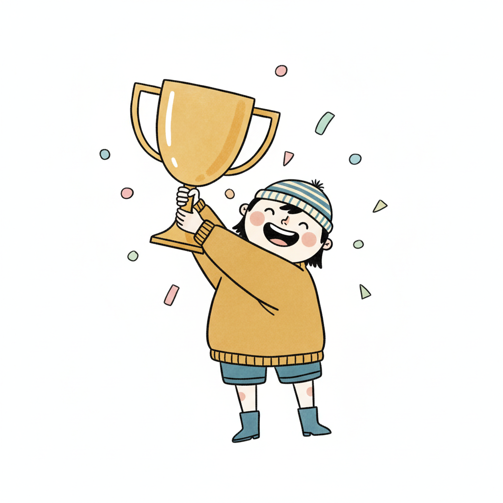 Fröhliches Kind hält stolz einen goldenen Pokal hoch, umgeben von Konfetti.