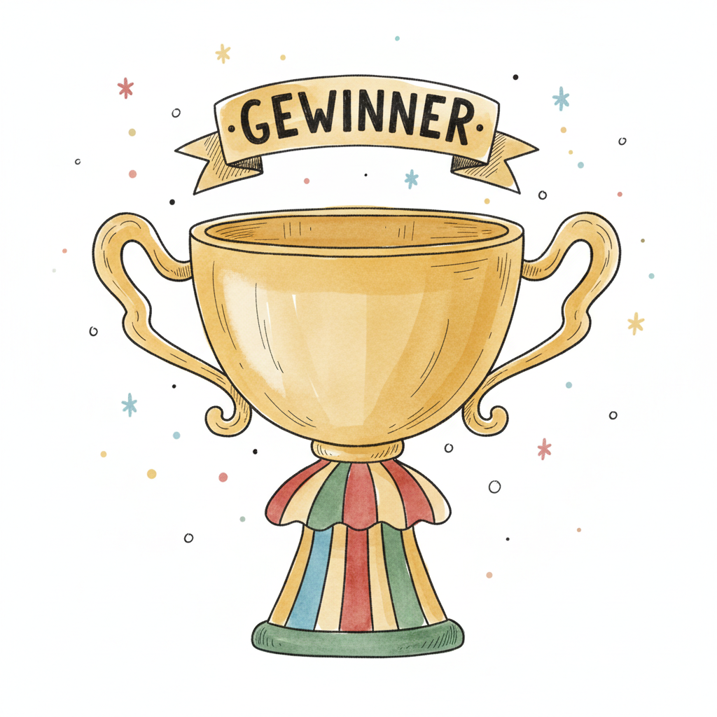 Illustrierter goldener Pokal mit 'GEWINNER'-Banner und buntem Sockel, umgeben von Sternen.