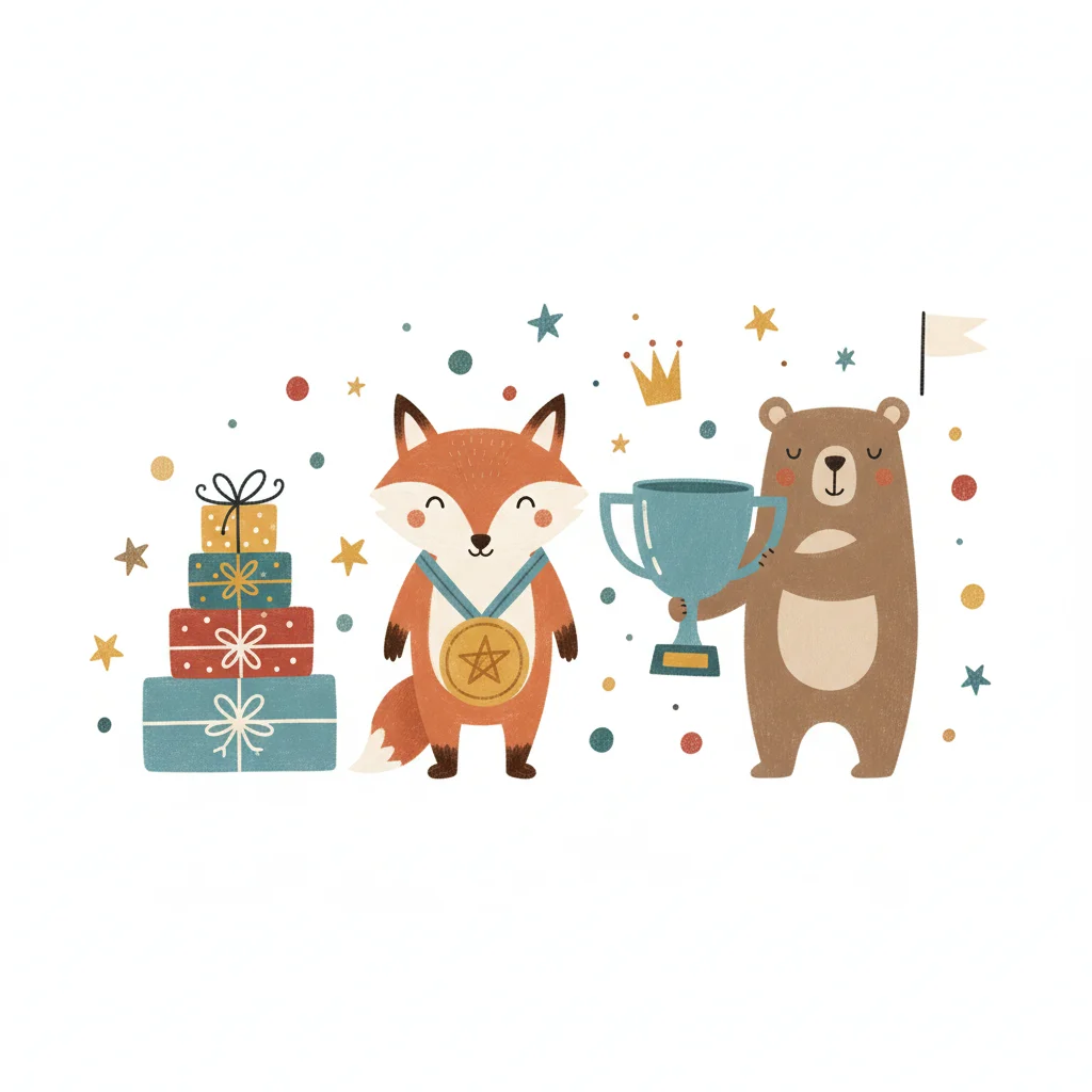 Süßer Fuchs mit Medaille und Bär mit Pokal feiern einen Erfolg mit Geschenken und Sternen.