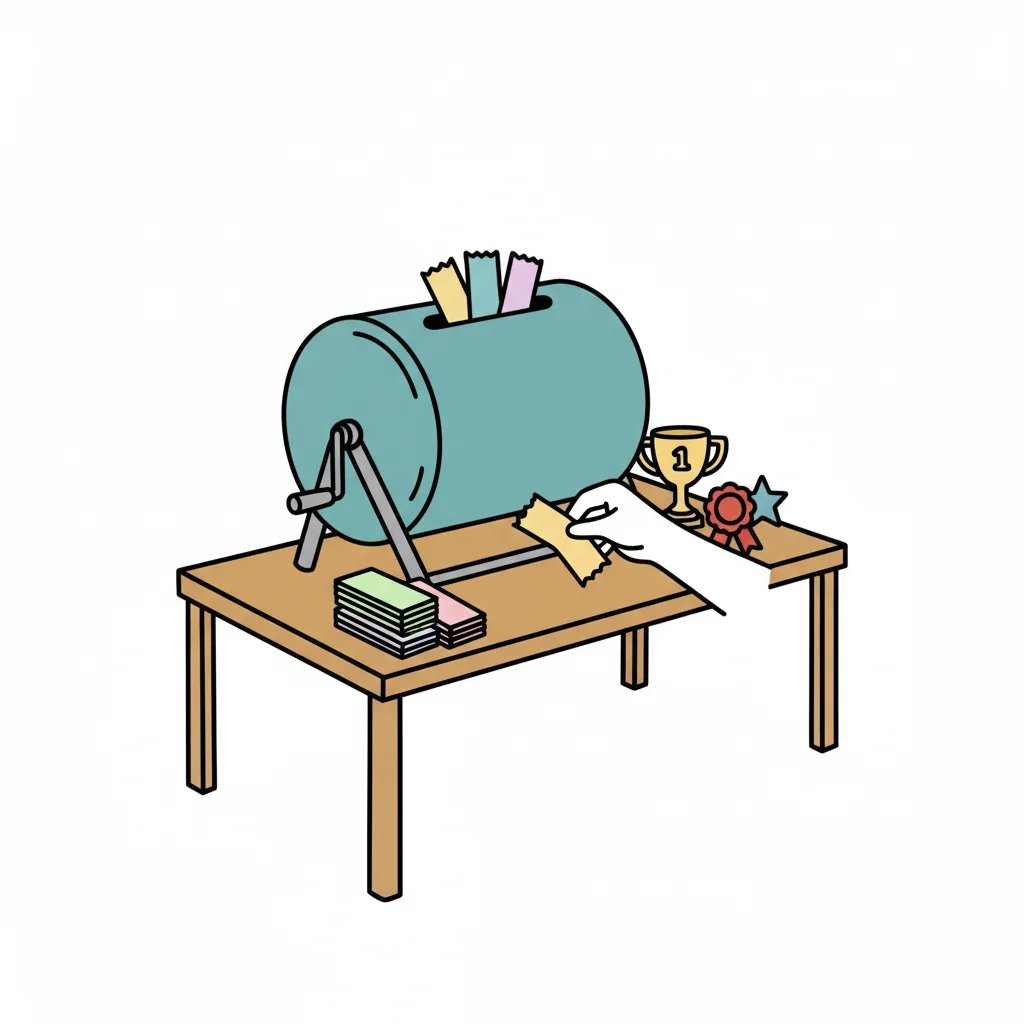 Eine Hand wirft ein Los in eine Lostrommel. Auf dem Tisch liegen Geld, ein Pokal und eine Medaille.
