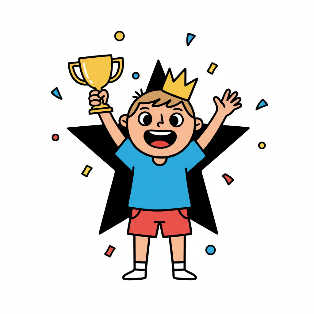 Ein fröhlicher Junge hält einen Pokal und feiert mit Konfetti.