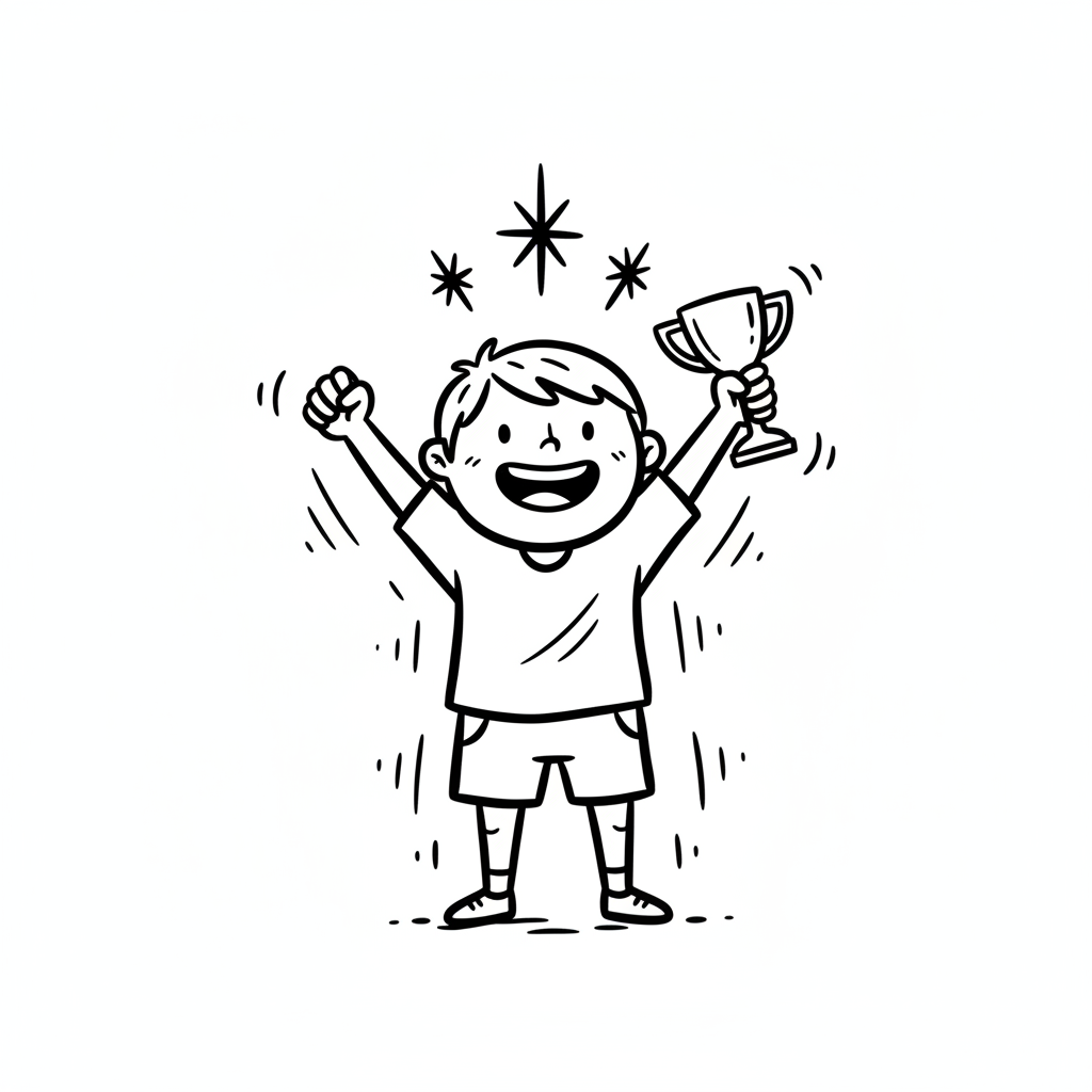 Ein glücklicher Junge hält einen Pokal hoch und jubelt.