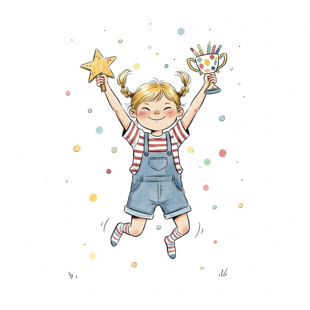 Ein fröhliches Kind mit Pokal und Konfetti, das Freude ausstrahlt.
