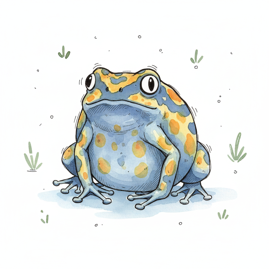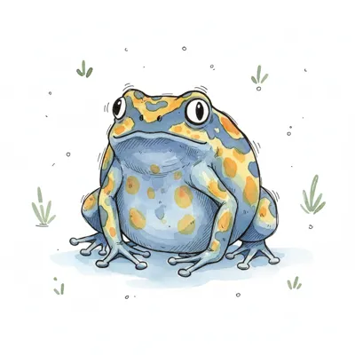 Niedlicher Frosch mit blauer Haut und gelben Flecken, im Cartoon-Stil gezeichnet.