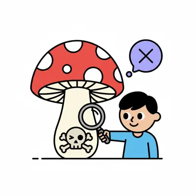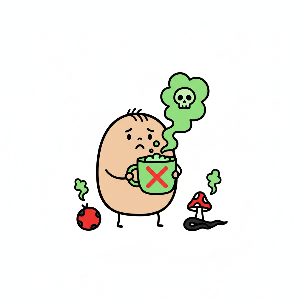 Cartoonfigur trinkt aus Tasse mit Totenkopf-Rauch, umgeben von giftigen Pilzen und Beeren.