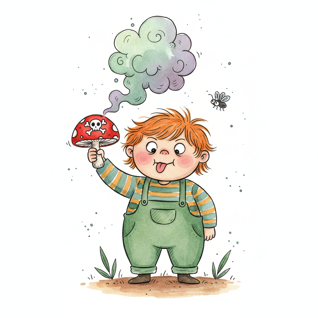 Niedliches Kind hält giftigen Pilz mit Totenkopf, aus dem Rauch aufsteigt. Zunge rausgestreckt.