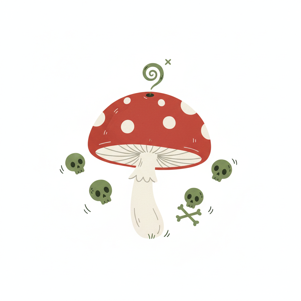 Illustration eines giftigen Fliegenpilzes mit schwebenden grünen Totenköpfen und Rauch.