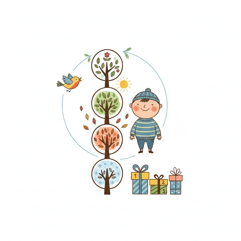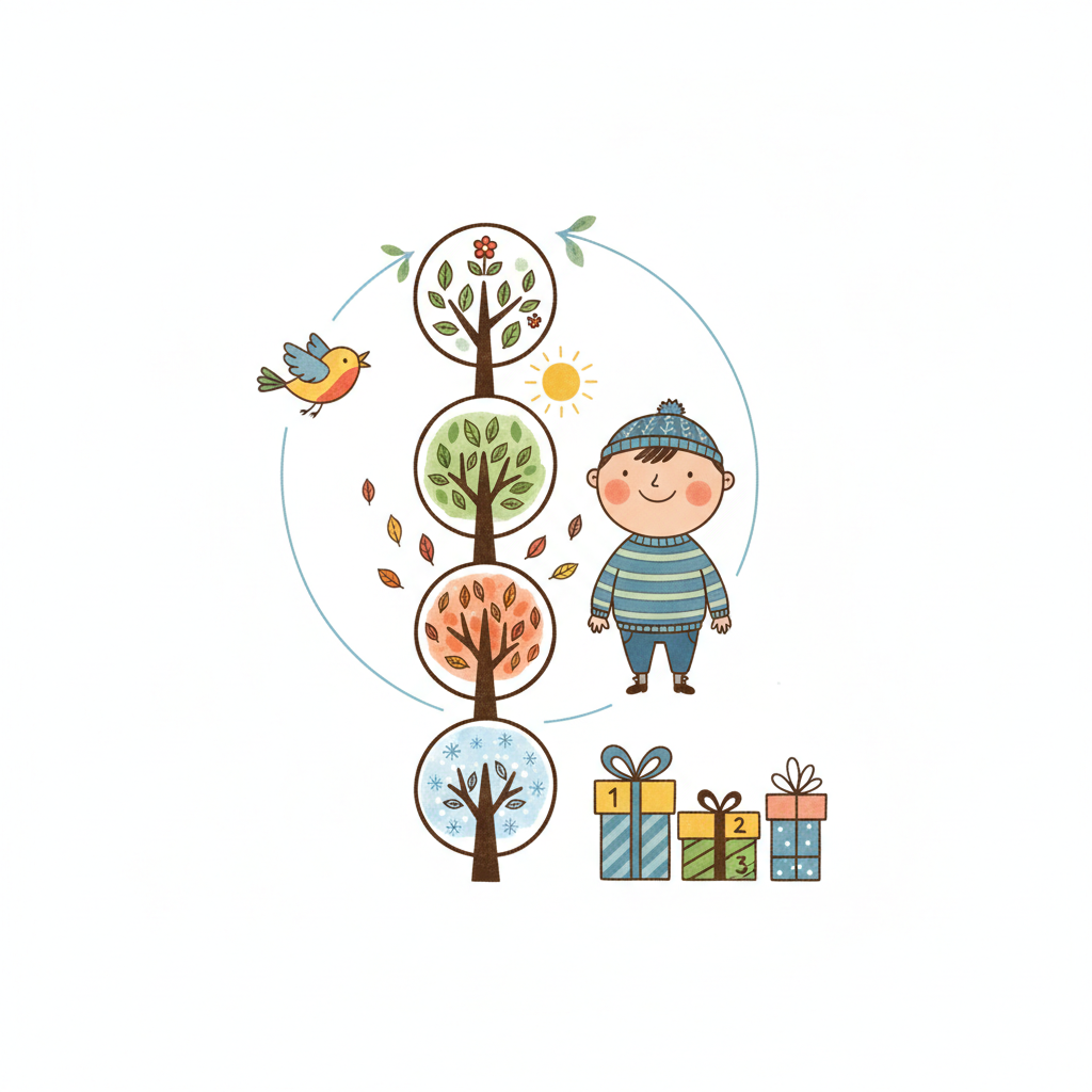 Cartoon boy, tree showing four seasons, bird, sun, and three numbered gifts. Represents time/growth.